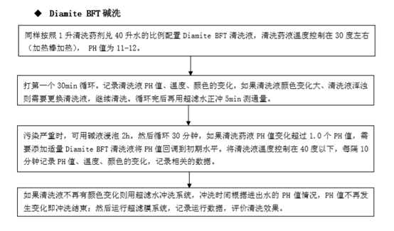 堿洗同樣按照 1 升清洗藥劑兌 40 升水的比例配置 Diamite BFT 清洗液,如果被有機(jī)物污染,則需要適當(dāng)延長清洗時(shí)間。正常情況下清洗30分鐘即可。堿洗完成后同樣需要使用凈水清洗。
