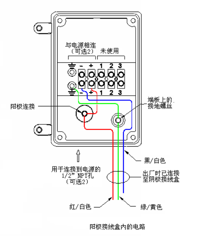 將導線管和電線從直流電源連接到陽極或陰極接線盒中的終端板。應有一條陽極引出線(+),一條陰極引出線(-),以及一條接地線。確保直流電線正確連接到直流電源,并符合當地的電氣規范。其中陽極引出線與陰極引出線的連接方式不太相同。