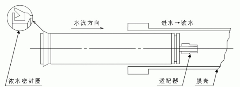 5、轉移至壓力容器進水端,將膜元件完全推入壓力容器,使出水端的端板密封組合件與第一支膜元件緊密接觸,然后安裝壓力容器進水端端板密封組合件;